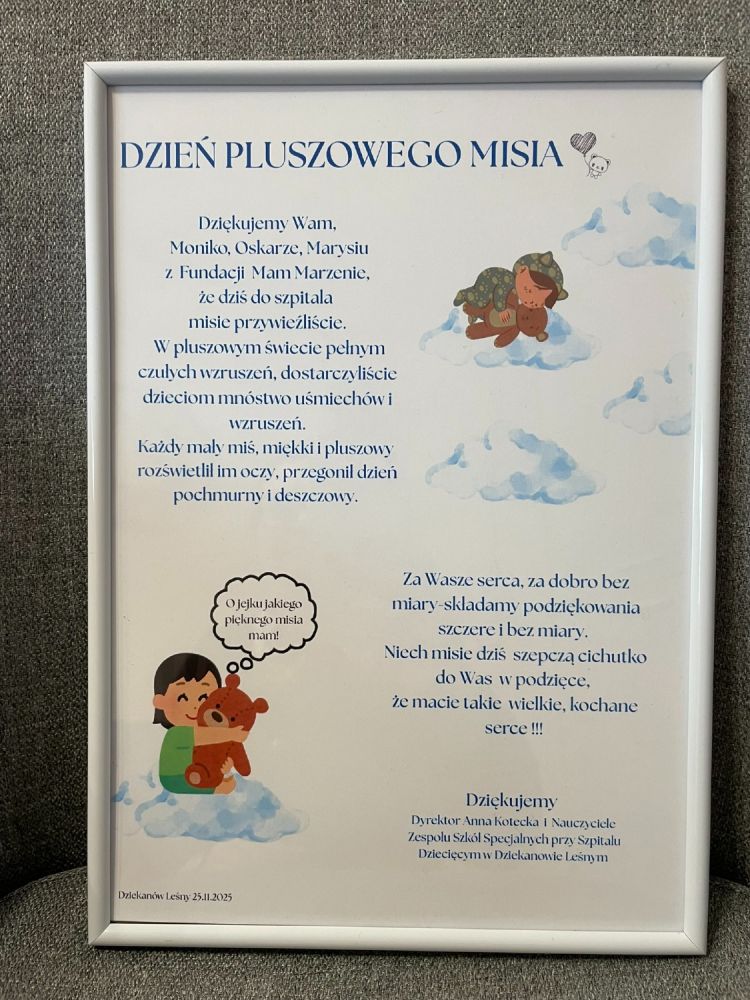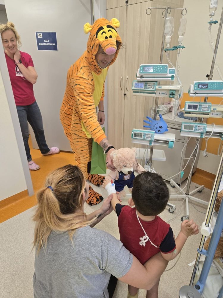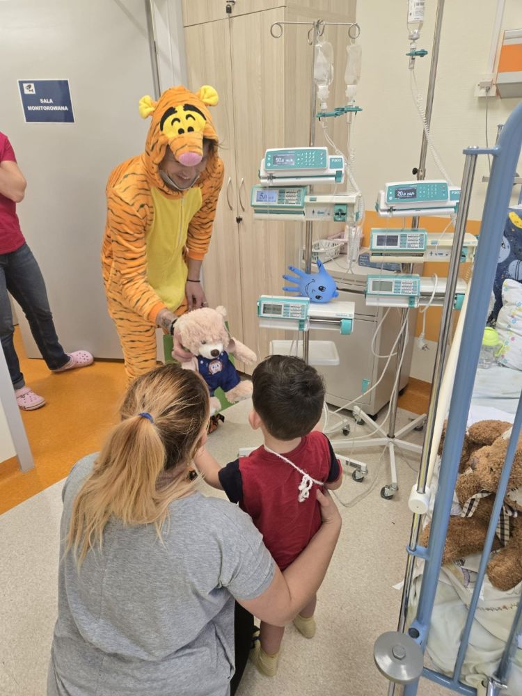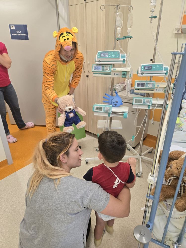 Dzien Pluszowego Misia to wyjątkowy dzień. W naszym szpitalu dziecięcym, obchodziliśmy go również w sposób wyjątkowy . Odwiedzili nas wolontariusze z Fundacji Mam Marzenie — Oskar i Marysia — którzy przynieśli ze sobą nie tylko ogromne serca, ale także mięciutkie, kolorowe pluszowe misie. Każde dziecko otrzymało swojego przyjaciela. Wiele małych twarzy rozjaśniło się na widok niespodzianki, a niektóre dzieci od razu mocno przytuliły nowe misie. Oskar i Marysia z ogromną życzliwością rozmawiali z dziećmi i ich rodzinami, tworząc serdeczną i pełną życzliwości atmosferę.